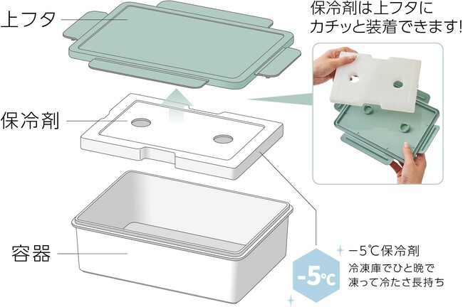 本製品は、上フタに保冷剤が装着できるフードコンテナです。保冷材は、冷凍庫で冷やすことでマイナス5℃に。また保冷材は取り外し可能で、上フタに取り付けることができます。更に、「ON℃ZONE PVCクーラーバッグ」内で使用することで一層冷たさが持続します。