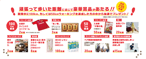 (3)期間中に50km、100kmウォーキングを達成すると、豪華賞品があたる抽選会に申込できます。