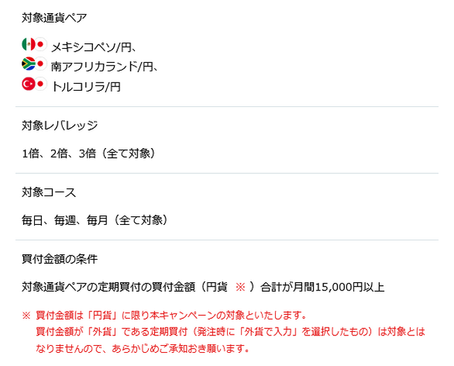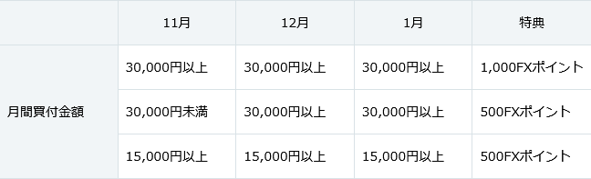 対象期間中の『らくらくFX積立』において、11月~1月の3ヵ月連続で月額3万円以上の定期買付をされたお客様に1,000FXポイントを、月額1万5千円以上の定期買付をされたお客様に500FXポイントをそれぞれプレゼントいたします。