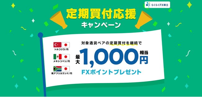 株式会社外為どっとコム(本社:東京都港区、代表取締役社長:竹内 淳)は、FX積立『らくらくFX積立』におきまして、2023年11月6日(月)より「定期買付応援キャンペーン」を実施します。