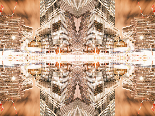 古賀勇人は、主に都市の光景を撮影する写真作家です。撮影した画像を反転させつなぎ合わせてシンメトリーの造形にすることで、都市を人々が畏敬の念を抱く対象、聖域(サンクチュアリ)として描き出します。