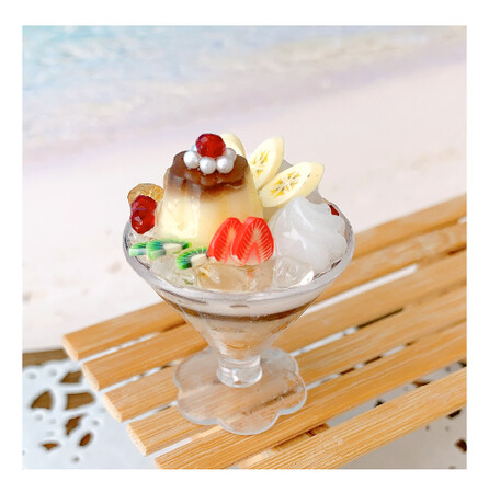 お皿も一緒にレジンで作ってミニチュアにしたり、グラスを使ってプリンアラモードにしてみたり。