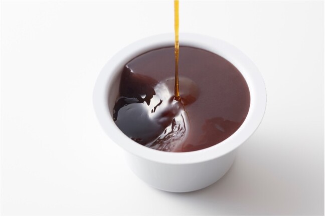 和菓子舗たねやの「たねや本生⽺羹」と「アチェ州ガヨ地区のコーヒーソース」。ディーンとたねやがお互いに大切にする素材を組み合わせた「ディーン・フジようかん」は食べ方にも一工夫。最初の一口で水⽺羹のみずみずしさを味わったあと、別添のコーヒーソースをかけることで豊かに広がるコーヒーの味をお楽しみいただけます。
