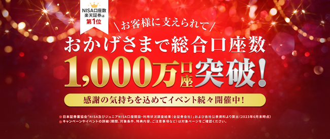 また、総合口座数1,000万口座達成を記念して、各種キャンペーンやイベントを実施します。第1弾は、本日、2023年12月5日(火)より、楽天証券公式Xアカウントをフォローし、「#1000万人の楽天証券」で引用リポストにてメッセージを投稿していただいた中から、素敵な投稿をしてくださった方10名様に5万円のギフト券をプレゼントするキャンペーンを実施します。今後のキャンペーンやイベントについては、ホームページをご覧ください。