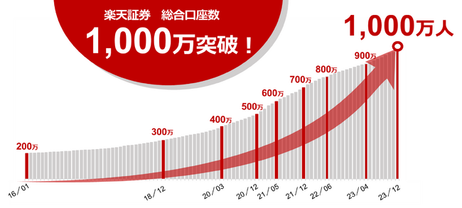 楽天証券株式会社(本社:東京都港区、代表取締役社長:楠 雄治、以下「楽天証券」)は、2023年12月に、証券総合口座数が国内証券会社単体(開示情報ベース)で最多※1の1,000万口座超となったことをお知らせします。また、1,000万口座達成を記念して、楽天証券公式TikTokを開設するほか、楽天証券公式X(旧Twitter)にて、「#1000万人の楽天証券」メッセージ投稿キャンペーンを本日、2023年12月5日(火)より実施しますので、あわせてお知らせします。