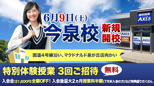 株式会社ワオ・コーポレーションが運営する「個別指導Axis(アクシス)」は、2018年6月9日(土)、栃木県宇都宮市今泉地区に「今泉校」を開校します。