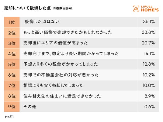 また、「売却において後悔したこと」についても聞いてみたところ、「後悔した点はない」(36.1%)が最も多かったものの、「もっと高い価格で売却できたかもしれなかった」(33.8%)、「売却後にエリアの価値が高まった」(20.7%)といった回答も上位となっており、最適な「売り時」を見極めることの難しさがうかがえます。