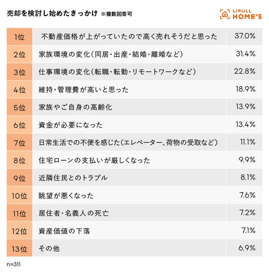 売却を検討し始めたきっかけは、「不動産価格が上がっていたので高く売れそうだと思った」(37.0%)が最も多く、「家庭環境の変化」(31.4%)、「仕事環境の変化」(22.8%)を上回っています。昨今の不動産価格の上昇を受けて、売却を検討し始めた人も多いと考えられます。