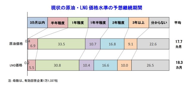 現在の高水準な価格がどの程度続くと想定しているかは、「1年程度」が原油(33.5%)、LNG(30.8%)ともに最多。これらを含め1年以上続くと考える企業はいずれも7割前後に達し、平均では原油が17.7カ月、LNGが18.3カ月となった