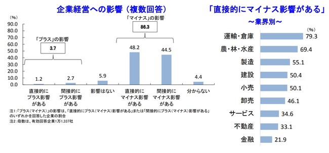 半数の企業が「直接マイナスの影響」、『運輸・倉庫』は約8割に
