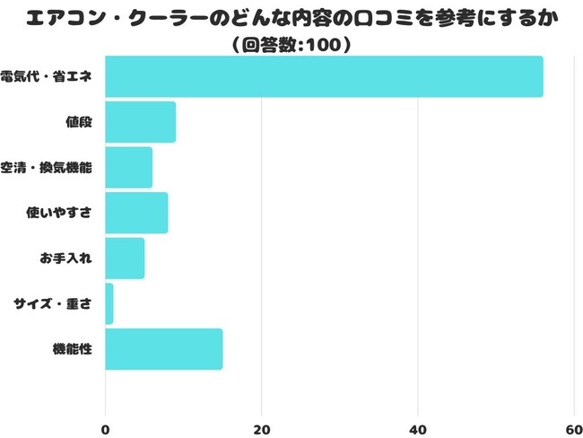 エアコン・クーラーのどんな内容の口コミを参考にするかをアンケートにて調査したところ、1位は「電気代・省エネ」でした。