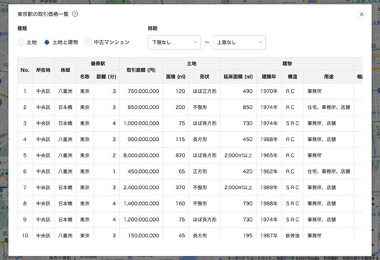 賃貸経営マップの「取引価格」の画面(東京駅を選択した場合)