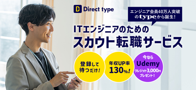 株式会社キャリアデザインセンターが運営するITエンジニア向けスカウト転職サービス「Direct type(ダイレクトタイプ)」https://directtype.jp/は、ITエンジニアのスキルアップを支援するため、「Udemyクレジット3000円分プレゼントキャンペーン」を実施いたします。また、このキャンペーンのプロモーションを8月中旬より開始。ITエンジニア向けのダイレクトリクルーティングサービスとしてDirect typeの認知を広げていきます。