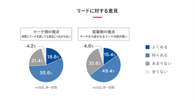マーケティング部門から営業部門に渡される見込み顧客のリードの活用状況について、マーケティング部門の7割は営業部門にリードを渡しても受注につながらないと感じることがあると回答しました。一方で、営業部門の6割はマーケティング部門から渡されるリードの質が悪いと感じることがあると回答しました。