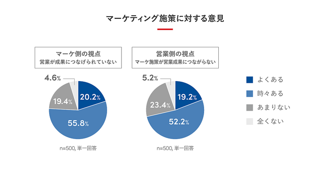 マーケティング部門が企画して行う展示会や広告などのマーケティング施策について、マーケティング部門の7割以上は、営業部門が成果につなげられていないと感じることが「よくある」「時々ある」と回答しました。反対に営業部門の7割以上は、マーケティング施策そのものが営業成果につながらないことが「よくある」「時々ある」と感じていると回答しました。