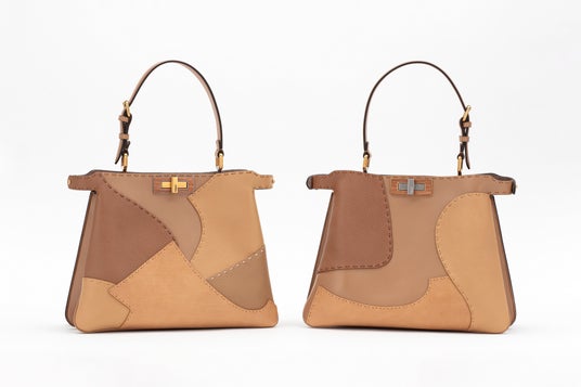 「ピーカブー ソフト ミディアム」バッグは、フェンディの職人たちがジャケットのパターンにカットしたレザーを合わせてパッチワークし、彼の作品のキーモチーフを模しています。「アエニグマ」コレクション全体に使用されている木材が内側のバーを形成し、また家具に使用されている2つの特徴的な金属を反映したシルバーと真鍮のクロージャーが使用されるなど、メタルパーツがさらにつながりを深めています。「ピーカブー ソフト」バッグを開くと、隠れていた木材の質感が現れます。