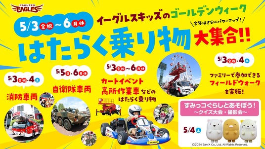株式会社楽天野球団(本社:宮城県仙台市宮城野区、代表取締役社長:森井 誠之)は、イーグルスキッズが楽しめるイベントとして、5月3日(金・祝)~6日(月・祝)『イーグルスキッズのGW』を開催することとなりましたので、お知らせいたします。