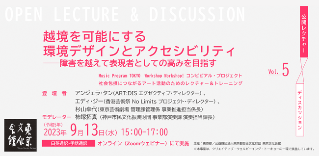 アジア地域で先進的な取組みを行っている「ART:DIS(シンガポール)」、「香港芸術祭 No Limits」の2団体に加え、公益財団法人東京都歴史文化財団における実践例を通じ、文化行政がどのようにアクセシビリティの問題に取組み、より質の高い芸術活動をすべての人に届けることができるのかを模索します。