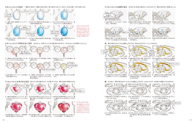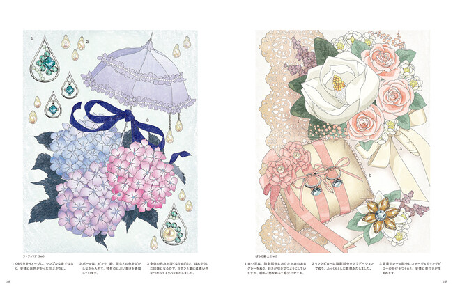 白い花や透明な宝石といった悩みがちなモチーフ、ジュエリーの輝きを表現する色のぬりかたも写真とプロセスでていねいに解説。
