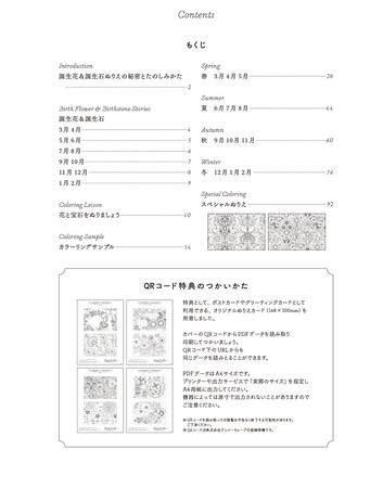 基本の誕生花&誕生石から、ボリュームのある作品まで、いろんなぬりえがたっぷり。
