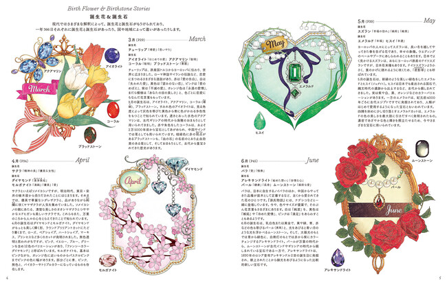 それぞれの花言葉や宝石言葉、世界中から集めた逸話を読めばあなたの誕生花と誕生石が、もっともっと魅力的に映るはず。宝石のカットなど、ジュエリーがさらに好きになる知識も。美しいエピソードの数々が、あなたのイマジネーションを広げてくれるでしょう。
