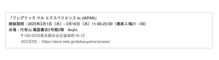 完全なる創造の自由から生まれるパルファムという芸術―“エディション ドゥ パルファム(香りの出版社)“として、世界最高峰の調香師たちと共に芸術的な香りを創り続けるフランス発のフレグランスブランド〈フレデリック マル〉。その世界観と人気の香りを体感できるプロモーションイベント「フレデリック マル エクスペリエンス in JAPAN」を代官山T-SITE内Anjinにて開催いたします。期間中は、ブランドの世界観に包まれながら、有名調香師たちが創作した人気フレグランスを楽しめるほか、会場内のカフェを利用された方には、特典をご用意しております。