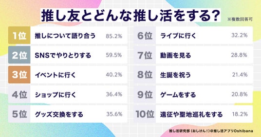 推し友との推し活で最も多かったのは、「推しについて語り合う」が85.2%という結果でした。上位10位までは以下の通りです。