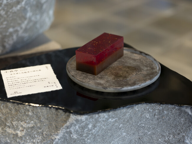 秋の真夜中、高く光る月に照らされて咲き誇る金木犀。星の花が降る一刻の美しさと、自分を見失ってしまいそうな甘い香り。それらを閉じ込めた心まで染め上げるような鮮やかな緋色の琥珀羹が、夜闇を透かした烏龍茶の水羊羹に寄り添う。エルダーフラワーとライムの月夜のソースと共に味わえば、花と茶のもたらす静かな余韻がどこまでも漂っていく。