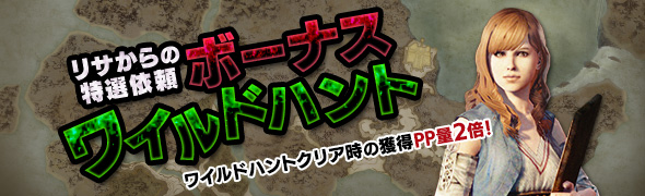 3月20日(水)まで、ワイルドハントのクリア時のプレイポイント(PP)獲得量が2倍になる「【リサからの特選依頼】ボーナスワイルドハント」を開催いたします。