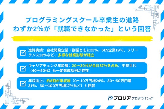 プログラミングスクール受講による成果と実績アンケート!無駄や意味ない印象を打ち消す結果に(https://prorea.jp/programming/columns/user-survey-programming-school-purpose/ )