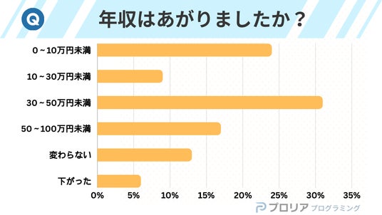約8割が年収アップを実感し、30~50万円の増加が31%と最多。わずかな割合が変わらず・下がった一方、大半が収益改善を実現。プログラミングスクール卒業後のスキル活用が実質的な収入増につながっています。