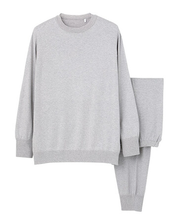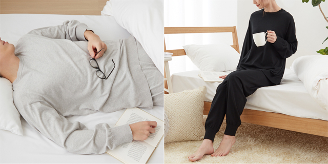 通常ルームウェアは、前身頃、後ろ身頃、袖などのパーツを縫い合わせて形にしますが、「寝落ちスウェット」は編み機で一着まるごと立体的に編み上げるホールガーメントで作られています。トップスは、前身頃と後身頃をつなぐ縫い目がなく、肩のラインも体にフィットし、自然な着心地が得られます。また、パンツの脇にも縫い目がなく、ごわつき感を解消。肌にやさしい綿・レーヨン・シルク混を採用するなど素材にもこだわりました。スウェット派の方はもちろんそうではない方にも体感いただきたい、まさに【寝落ち】してしまうほどのここちいい着用感のスウェットです。