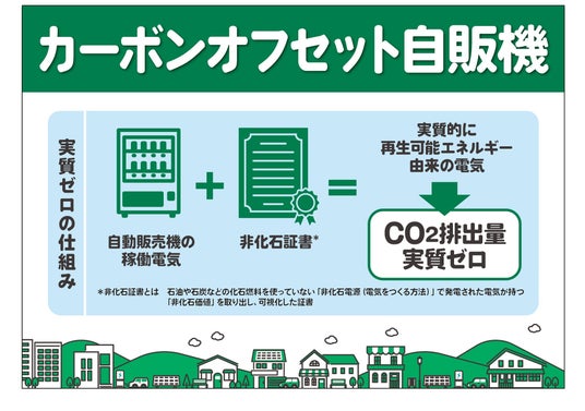 2023年11月に導入した「カーボンオフセット自販機」は、稼働電気分に相当する非化石証書を購入することで、再生可能エネルギー由来の電力を使用したとみなされ、CO2排出量を相殺(カーボンオフセット)することが可能となります。