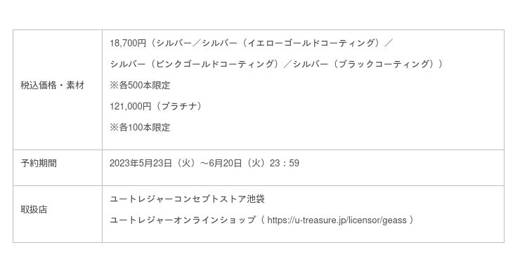 株式会社ユートレジャー(本社:東京都豊島区、代表取締役:伊藤 崇史)は、株式会社バンダイナムコフィルムワークス【コードギアス 反逆のルルーシュ】とのコラボレーションアイテム「メッセージリング(指輪)」を2023年5月23日(火)~6月20日(火)の期間限定で予約受付を行います。