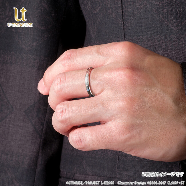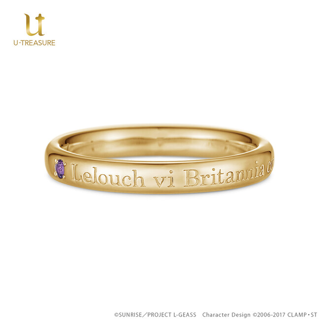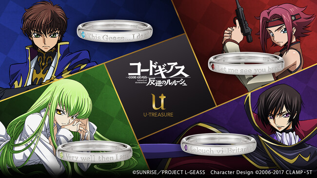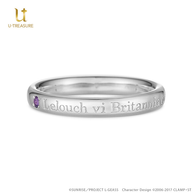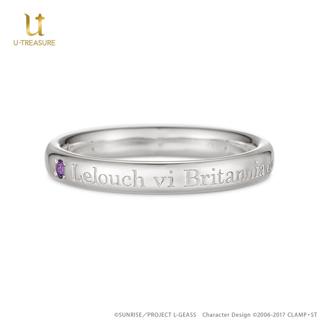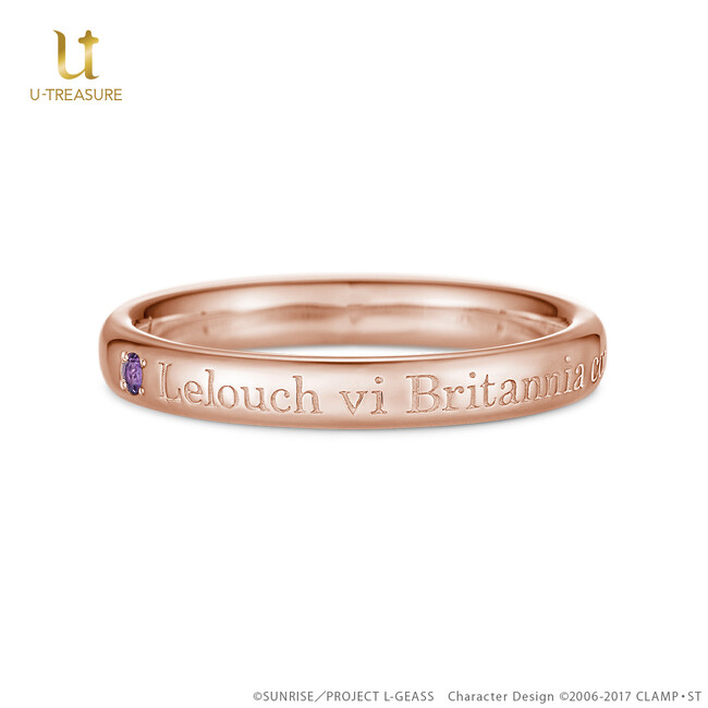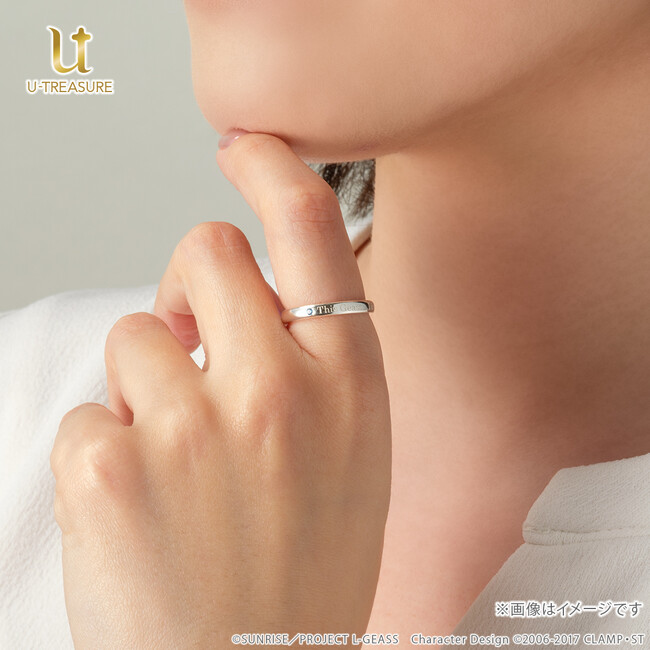 このたびの新作は、【コードギアス 反逆のルルーシュ】主人公「ルルーシュ」、「スザク」、「C.C.」「カレン」それぞれをイメージした天然石をあしらい、印象的なセリフを刻印したメッセージリング(指輪)です。普段のファッションへも取り入れやすいよう、デザインはシンプルに、素材は5種類ご用意しました。シルバーは各500本、プラチナは各100本の数量限定です。ユートレジャーコンセプトストア池袋、ユートレジャーオンラインショップにて取り扱います。