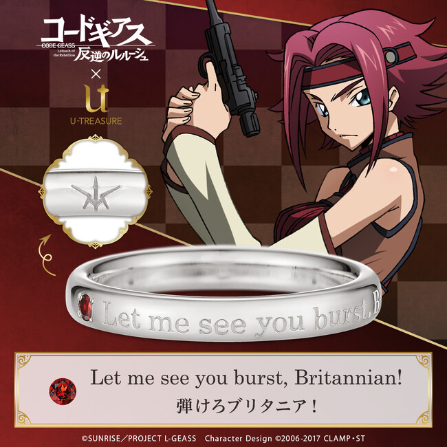 カレンの印象的なセリフ「弾けろブリタニア!(Let me see you burst, Britannian!)」を刻印したメッセージリング。