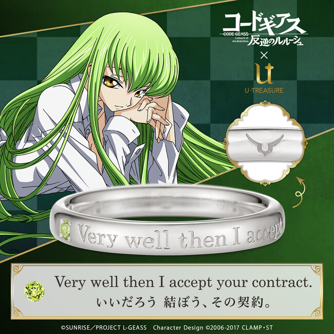 C.C.の印象的なセリフ「いいだろう 結ぼう、その契約(Very well then I accept your contract.)」を刻印したメッセージリング。