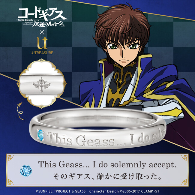 スザクの印象的なセリフ「そのギアス、確かに受け取った(This Geass... I do solemnly accept.)」を刻印したメッセージリング。