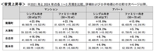 ■マンションの家賃は、大津町のシングル向きで+36.7%と、菊陽町と大津町ではシングル向き・ファミリー向きともに2桁の上昇率となった。両町の平均家賃は熊本市より高くなった。