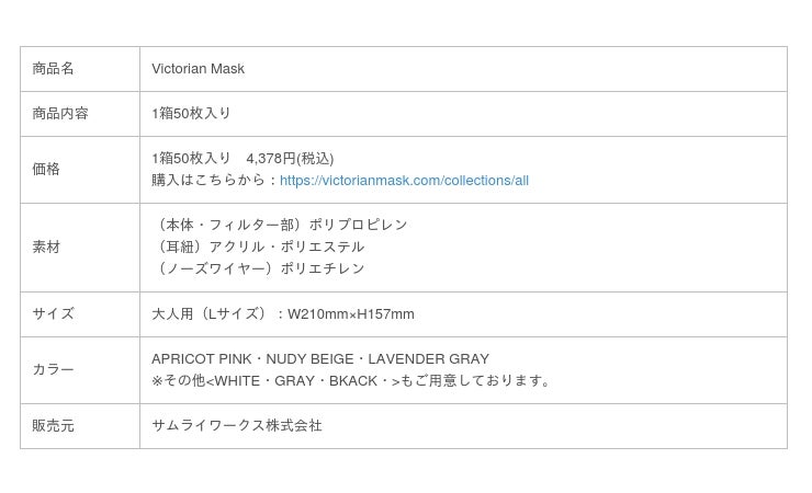 サムライワークス株式会社(代表取締役社長:新島 実 本社所在地:東京都渋谷区)は、累計販売数1,000万枚以上を突破している、大人気の『Victorian Mask』から顔色が映え、チーク効果が期待できる「APRICOT PINK」「NUDY BEIGE」「LAVENDER GRAY」の新色にお得な1箱50枚入りセットを【公式通販サイト限定】4,378円で新発売いたします。さらに先日、日本の検査機関にてPFE効率試験の調査をした結果、約0.1㎛サイズの微粒子を99.9%ろ過(捕集)できるという検査結果が得られました。