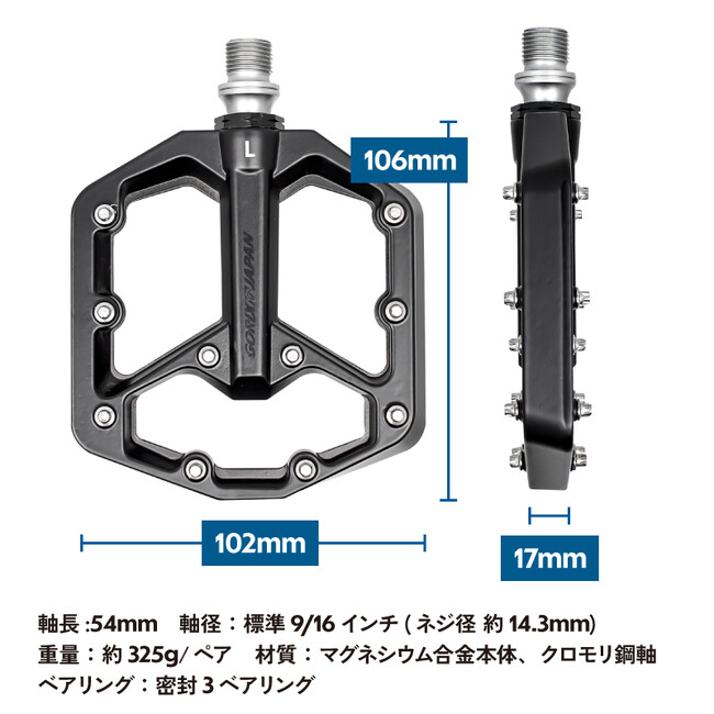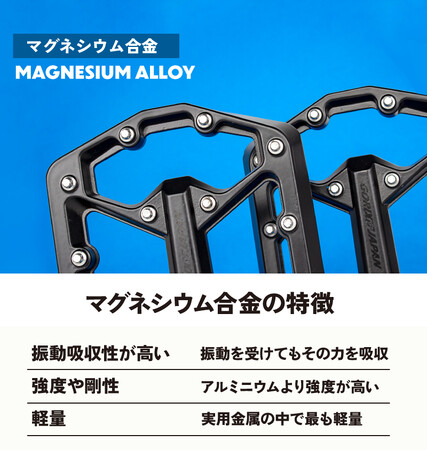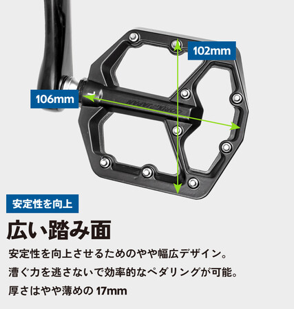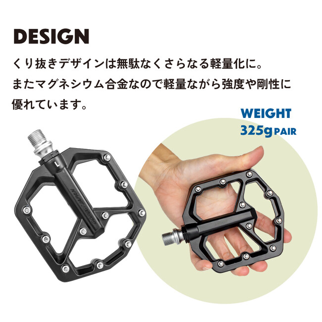 マグネシウム合金を使用していて、軽量ながらも強度と剛性に優れており、走行時のパフォーマンスを最大限に引き出すことができるペダルです。ワイドな大きい踏み面は足をしっかりと踏めて、安心感をもたらします。