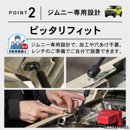 ジムニー/ジムニーシエラ/ノマド専用 JB64W JB74W JC74W専用 ボンネットダンパー。しっかりと支える機能性を持ちながら、ジムニーのエンジンルームに美しく調和するデザイン。