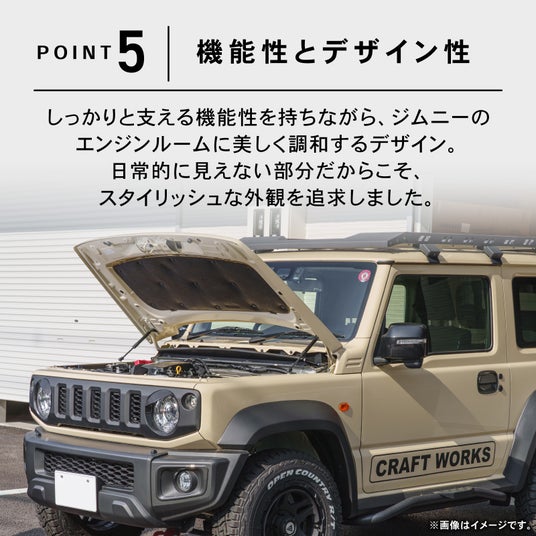 しっかりと支える機能性を持ちながら、デザインにもこだわり、ジムニーのエンジンルームに美しく調和します。