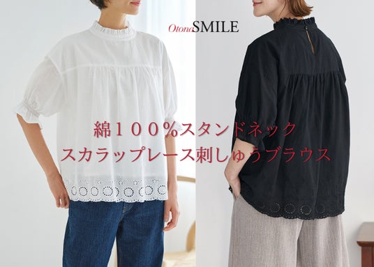 商品名:綿100%スタンドネックスカラップレース刺しゅうブラウス