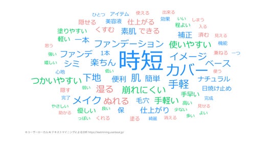 →BBクリームのイメージを伺ったところ「時短」がトップ、他にも「カバー」「手軽」などのワードが多く集まりました。1本で何役も担うBBクリームは、時短アイテムのイメージが強いようです。