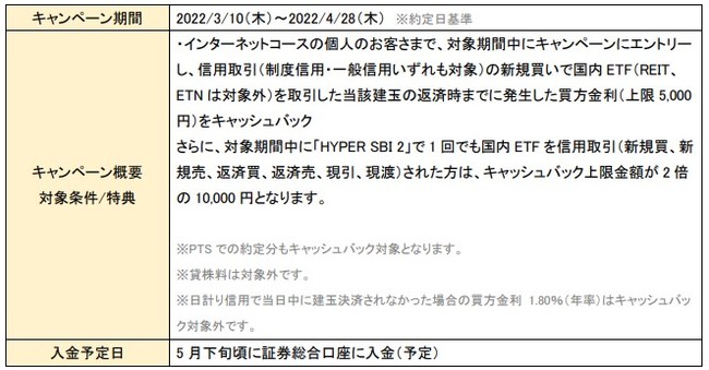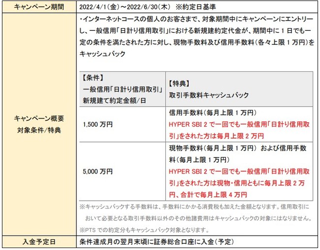 株式会社SBI証券(本社:東京都港区、代表取締役社長:高村正人、以下「当社」)は、2022年3月10日(木)から順次、「HYPER SBI 2リリース&日計り信用コスト引き下げW記念キャンペーン」と題し、以下2つのキャッシュバックキャンペーンを実施します。両キャンペーンでは、対象期間中に一回でもトレーディングツール「HYPER SBI 2」を利用して対象取引を行った場合に、キャッシュバック金額の上限が2倍になります。