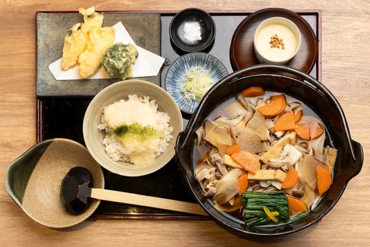 自家製の煮ぼうとうに深谷ねぎ天、ブロッコリー天、麦とろ飯と蕎麦茶プリンも添えた贅沢御膳です。