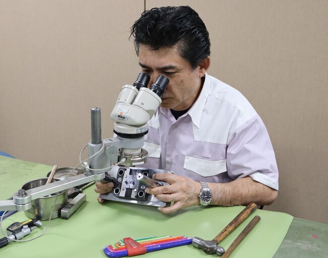 盛岡セイコー工業は、セイコーウオッチが誇る高級時計<グランドセイコー>などの製造を行っています。高級機械式腕時計に使用される精密な部品一つひとつを製造するためには、微細部品用の超精密プレス金型が必要とされますが、山崎 英人は、金型の製作においてミクロンレベルの調整技術を持ち、機械加工では成しえない部品精度の高さと美しさを実現する業界トップクラスの技能者です。このような技能が評価され、2021年には「卓越した技能者(現代の名工)」として表彰されています。