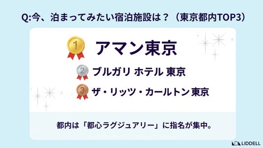 「泊まってみたい宿」の集計を見ると、都内は都心ラグジュアリーに指名が集中する一方、全国では“ リゾート&温泉 ”系が上位に入りました。ランキング上位には、都内ではラグジュアリーホテル、全国ではリゾートや温泉地の宿が並び、インフルエンサーが“ 今、行きたい ”と感じる方向性がうかがえます。つまり、ランキングは単なる“ 好み ”ではなく、「行きたい理由」が言語化される前の欲求を映すヒントになり得ます。こうした「今、指名される宿」は、インフルエンサーだけでなく、一般の旅行者がこれから求める“ 行きたい理由 ”の先取りになっている可能性があります。