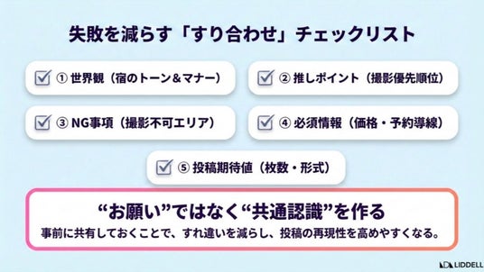 - 依頼を整える:依頼内容や撮影範囲、投稿の期待値を整理して共有し、すり合わせの手間を軽くします。